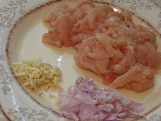 In a large, deep skillet, put 2 TBs cooking oil. Add in shallots and garlic on medium heat until caramelized. Add in the chicken breast pieces. Sprinkle some salt, pepper, and some Mrs.Dash seasoning. Don’t add a lot of salt because the soy sauce/peanut sauce will have enough.  Allow to cook on medium heat, stirring occasionally.  Cover the skillet and lower heat.  Image