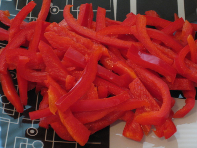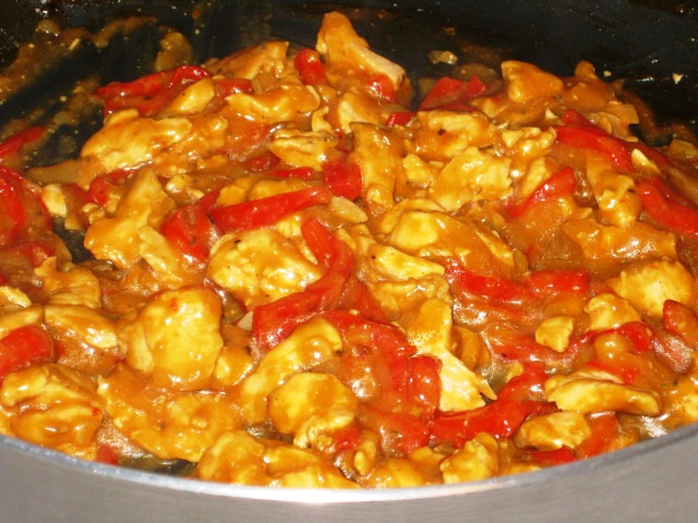 Add in the soy sauce/peanut sauce to chicken and peppers. The sauce will thicken quickly. Keep adding water until you find the consistency you want. I used about 1/2 cup of water. Bring to a boil and remove from heat.Image