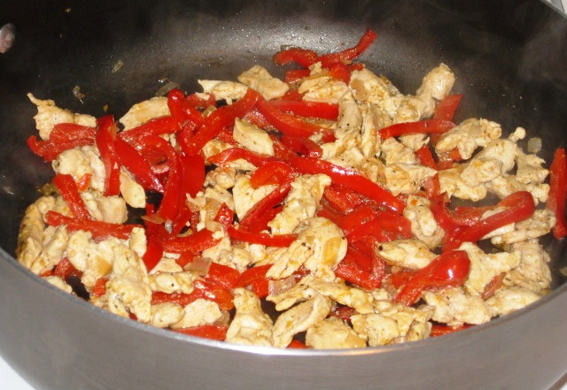 Once the chicken is cooked, add in the bell peppers. Cover skillet again and allow peppers to cook. Stir occasionally. Simmer for about 10 minutes.Image