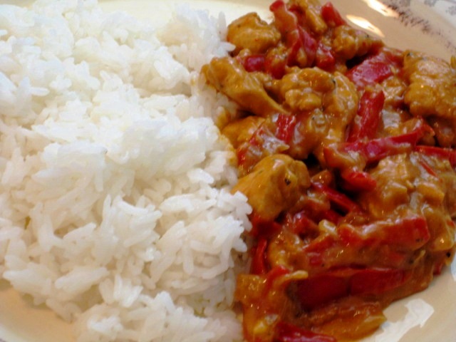 Now, doesn’t that look yummers? The wonderful peanuty flavor and sweet red peppers is divine. You can eat this dish plain or with rice.  I chose to eat it with rice. I’m Filipino, come on,now. You gotta have the rice!  🙂 Image
