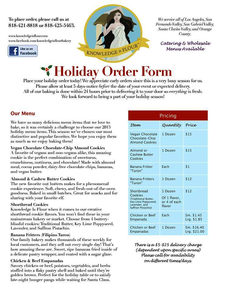 Our 2013 Holiday Menu is now available! Place your orders in early. Posted on November 15, 2013 by Melody We are very excited to share our 2013 holiday menu with you! Take a look and get your orders in early. Catering and wholesale prices are also available separately. Share this: Click to share on X (Opens in new window) X Click to share on Facebook (Opens in new window) Facebook Like Loading... Related