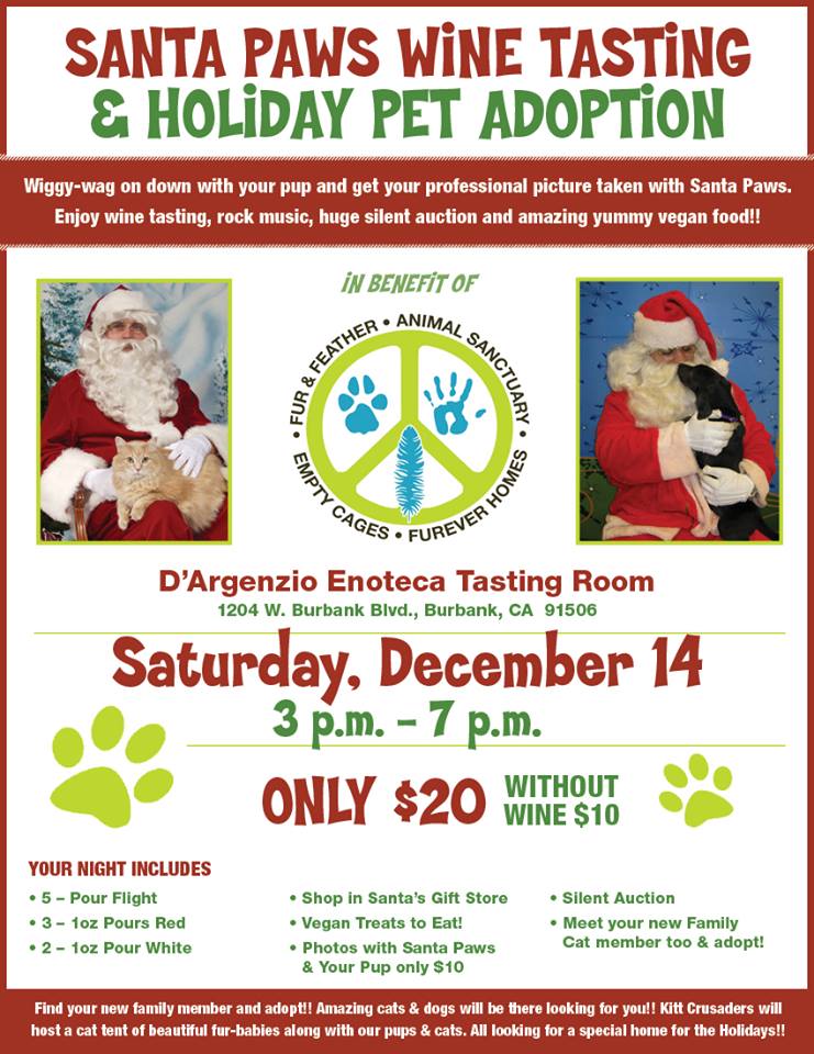 Please join us this Saturday, Dec 14th, 2013 for the SANTA PAWS & WINE TASTING – DOG/CAT ADOPTION to benefit Fur & Feather Animal Sanctuary!