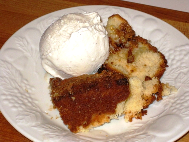 After an hour & half of baking, I let the cake cool a bit but kept it warm enough. Once cooled, you can cut them up into squares or serve a la mode while warm like I’m having.